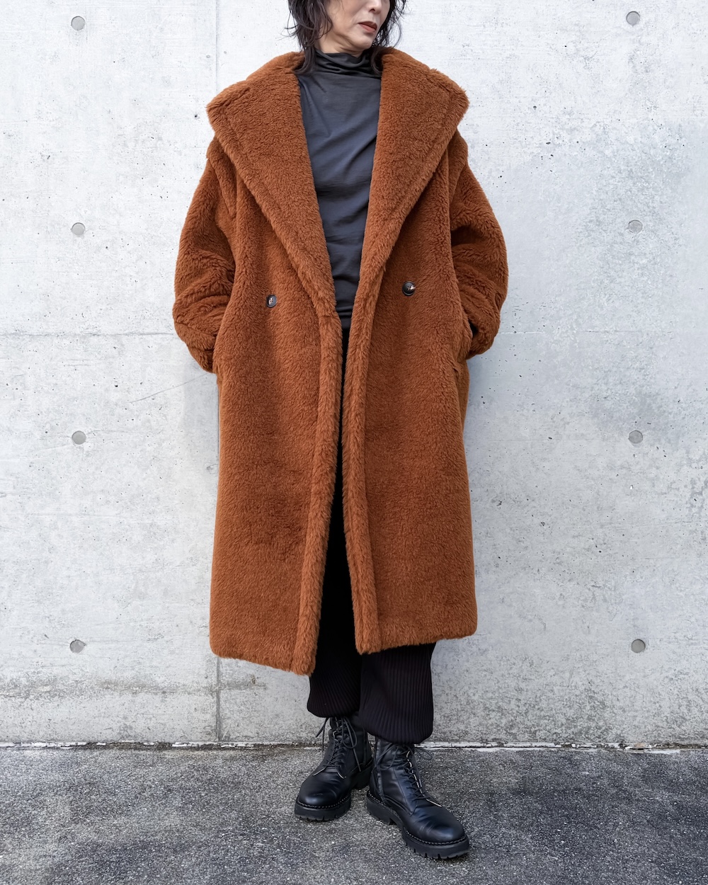 体を包み込むダブルブレストのオーバーサイズフィットのコートは、ショルダーラインも低くデザインし、リラックスした印象に。