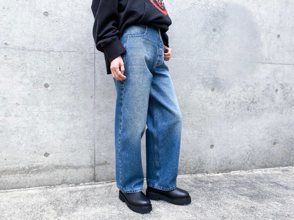 フロントボタンのアクセントと絶妙な色落ちが魅力のMM6の定番人気デニムパンツ。