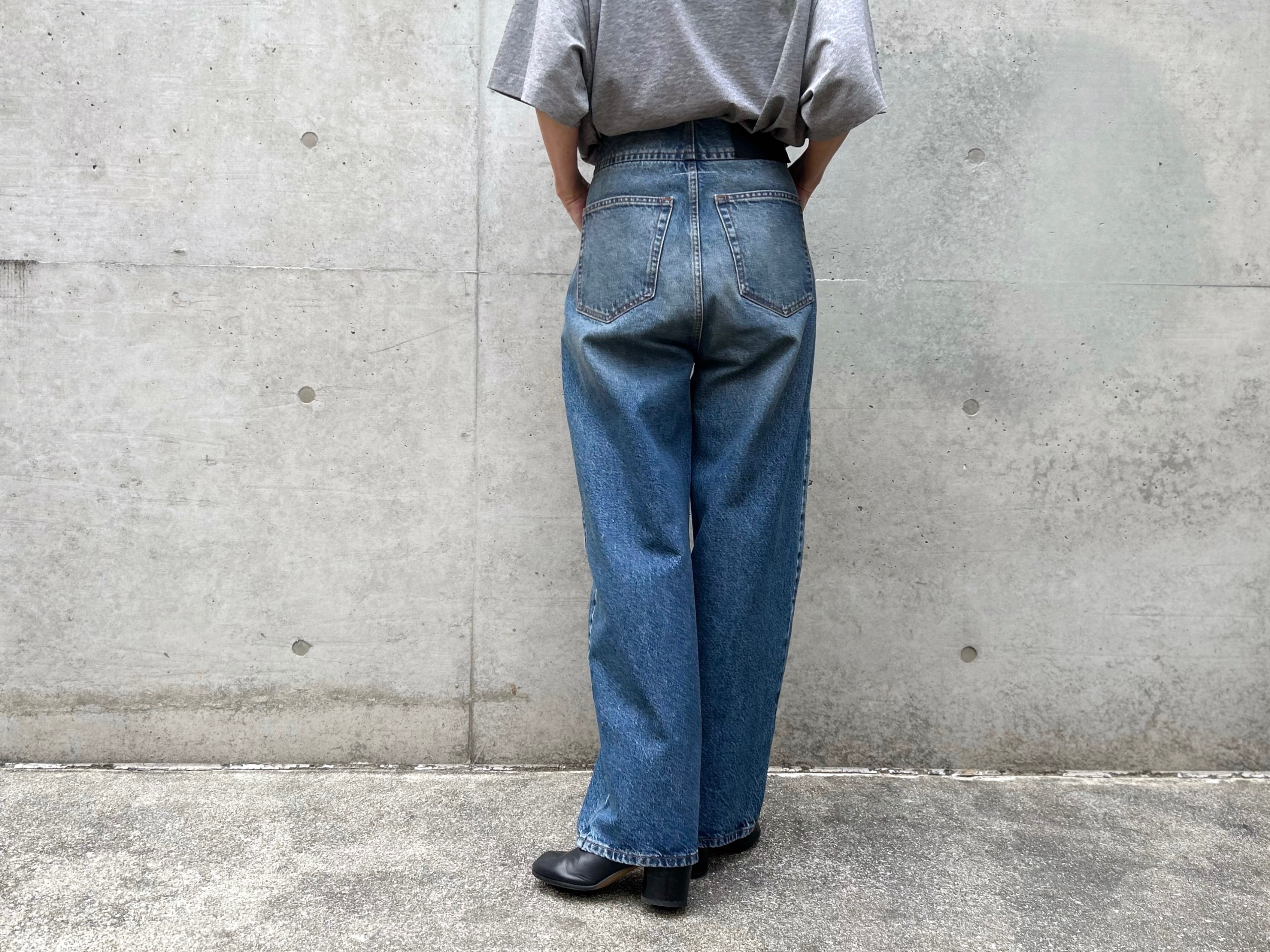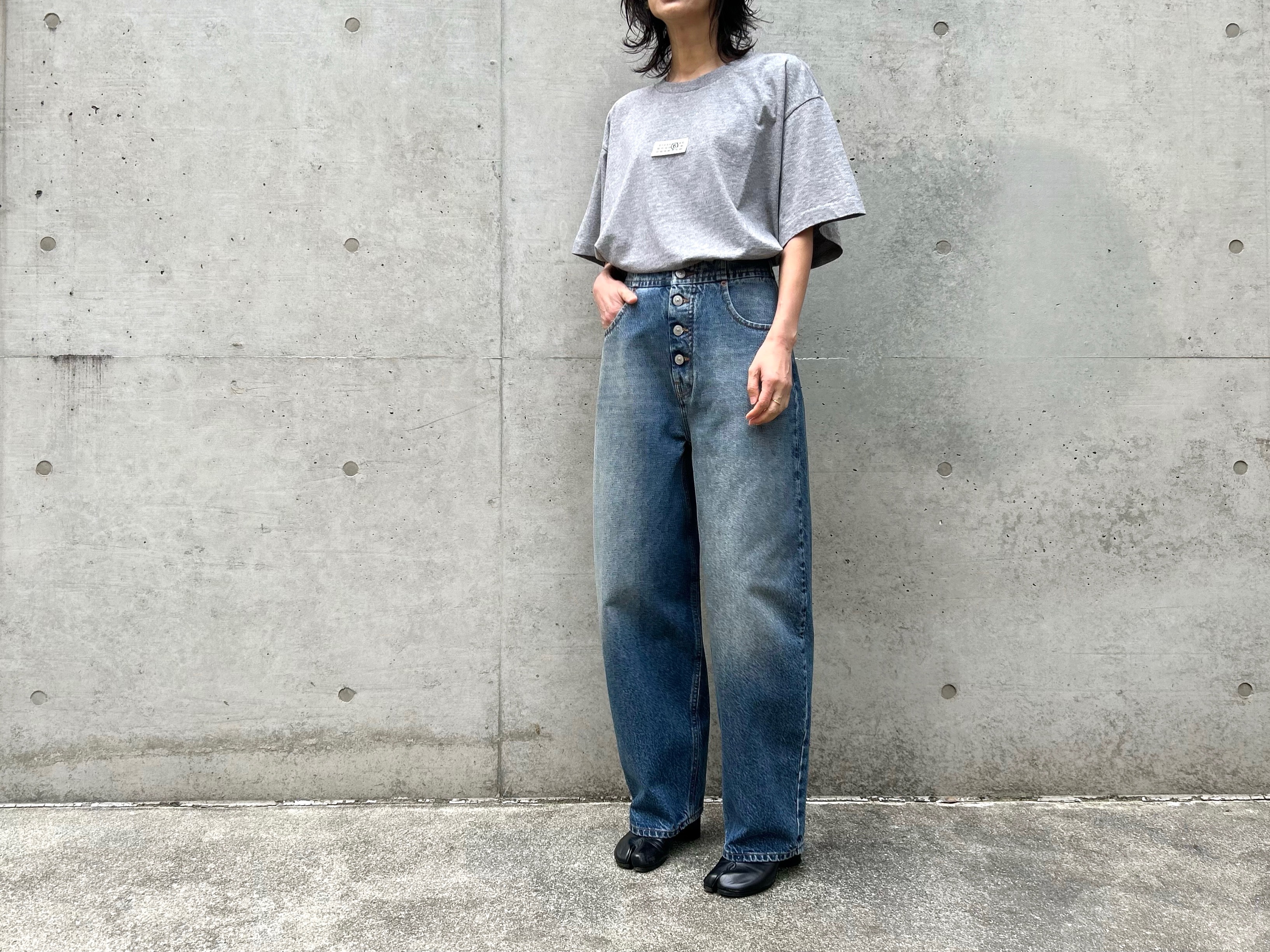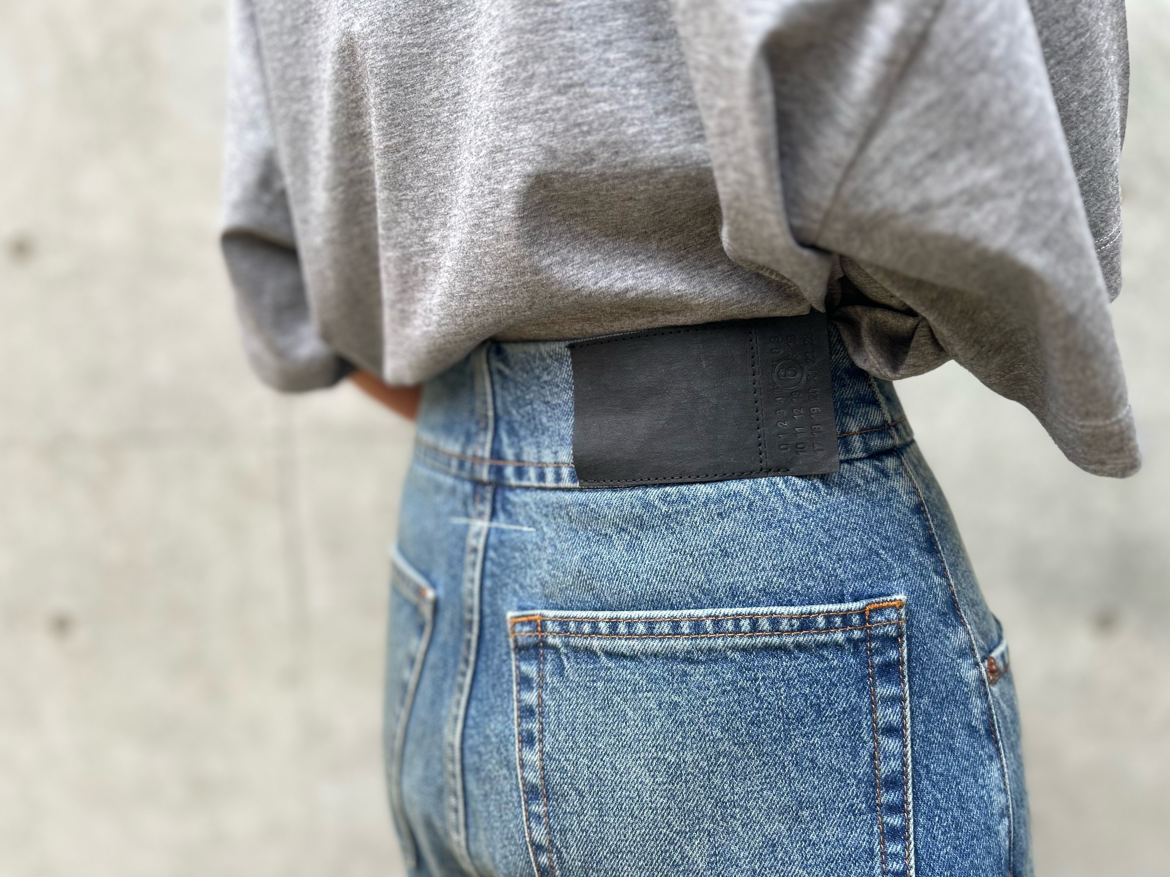 ハイライズのストレートレッグ。コットンデニムにタバコカラーのコントラストステッチを効かせています。ボタンフロントとベルトループが全体を縁取り、5ポケットの構築でクラシックな面構えに。バックには、MM6のニューメリックロゴ アートワークのパッチと、ブランドのアイデンティティを示す1本の白いステッチが施されています。