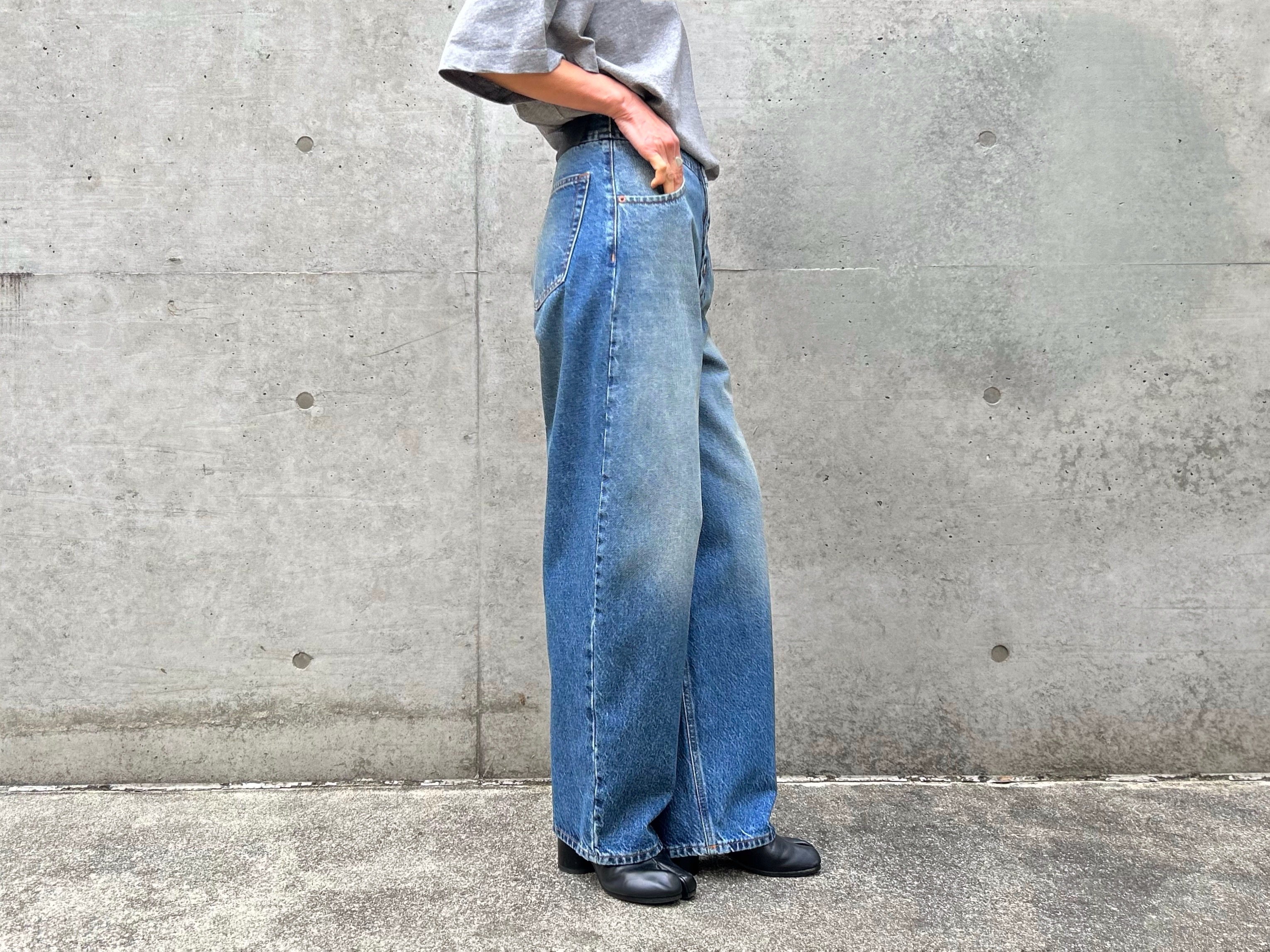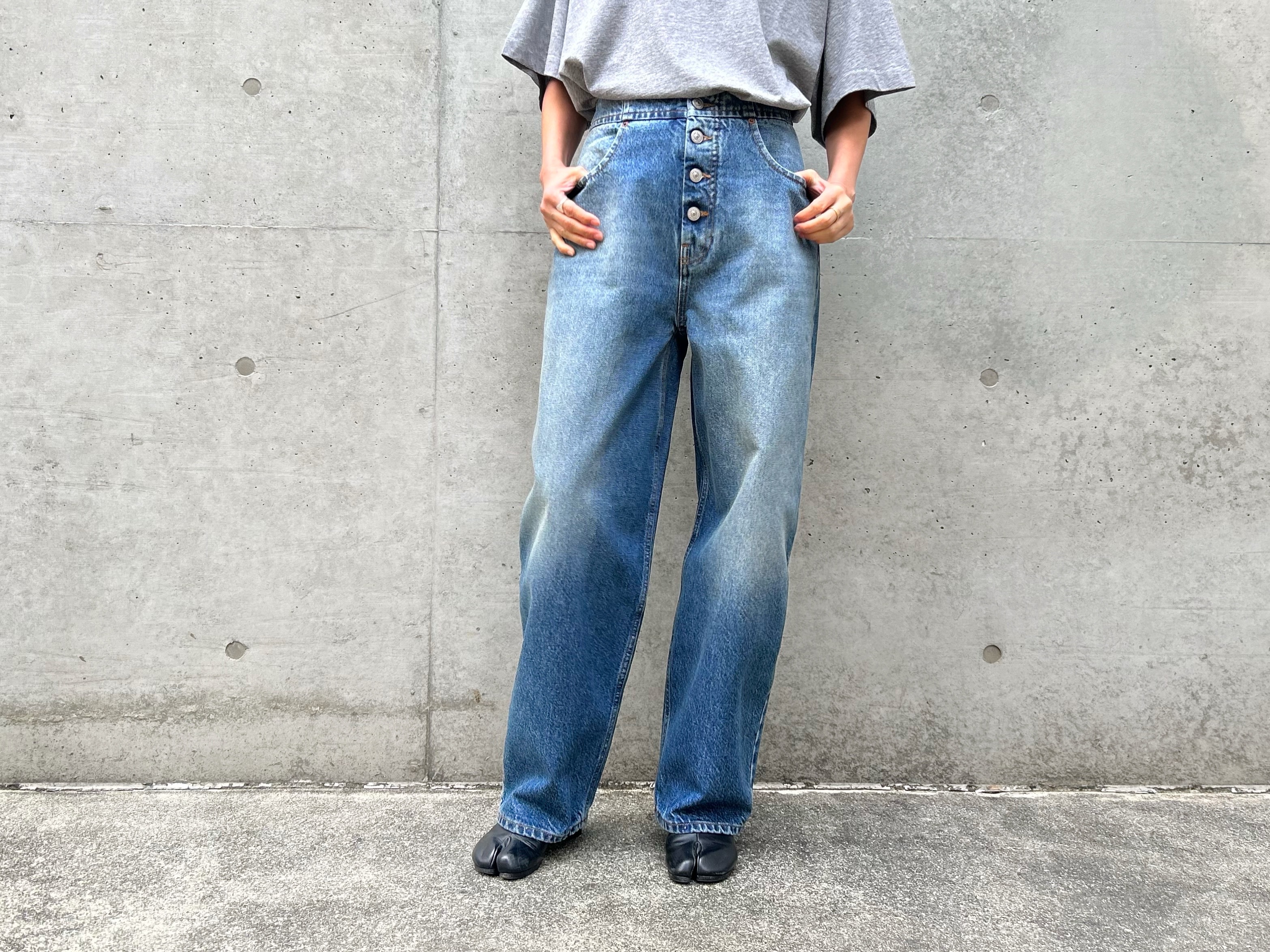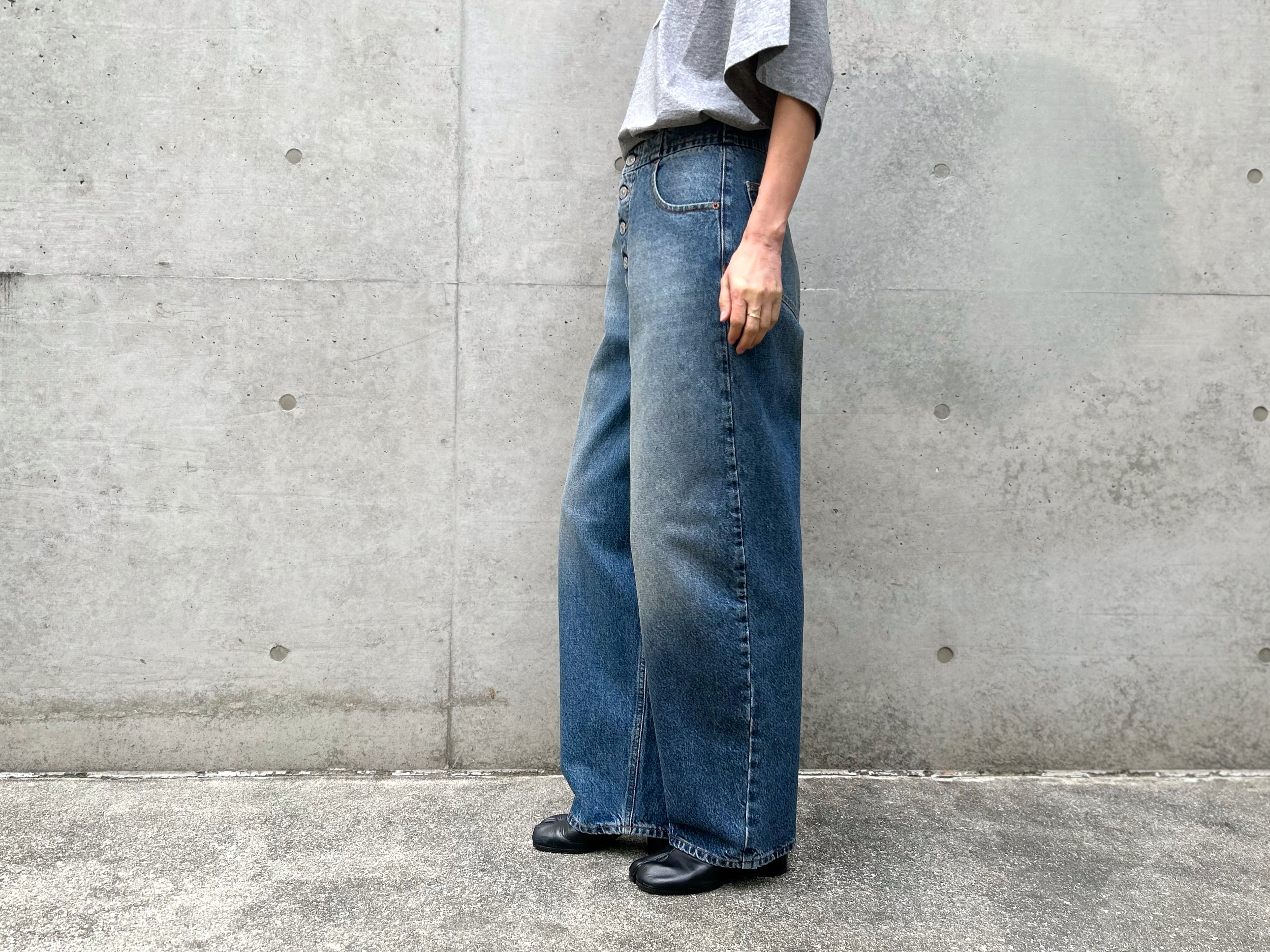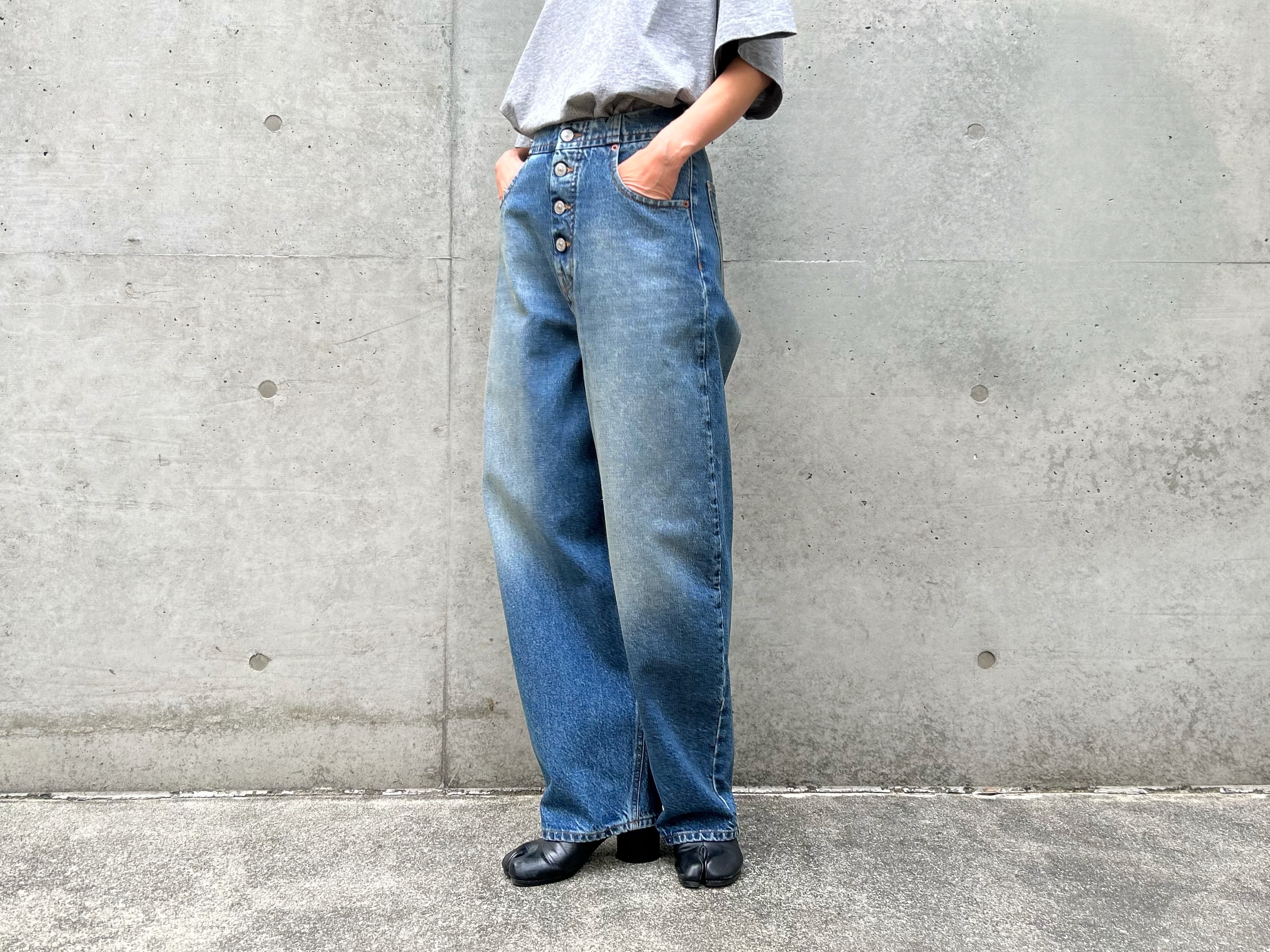 ハイライズのストレートレッグ。コットンデニムにタバコカラーのコントラストステッチを効かせています。ボタンフロントとベルトループが全体を縁取り、5ポケットの構築でクラシックな面構えに。バックには、MM6のニューメリックロゴ アートワークのパッチと、ブランドのアイデンティティを示す1本の白いステッチが施されています。