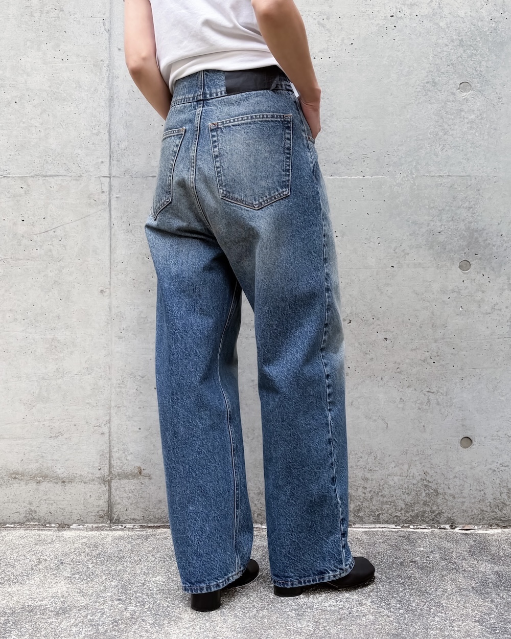 ハイライズのストレートレッグ。コットンデニムにタバコカラーのコントラストステッチを効かせています。ボタンフロントとベルトループが全体を縁取り、5ポケットの構築でクラシックな面構えに。バックには、MM6のニューメリックロゴ アートワークのパッチと、ブランドのアイデンティティを示す1本の白いステッチが施されています。