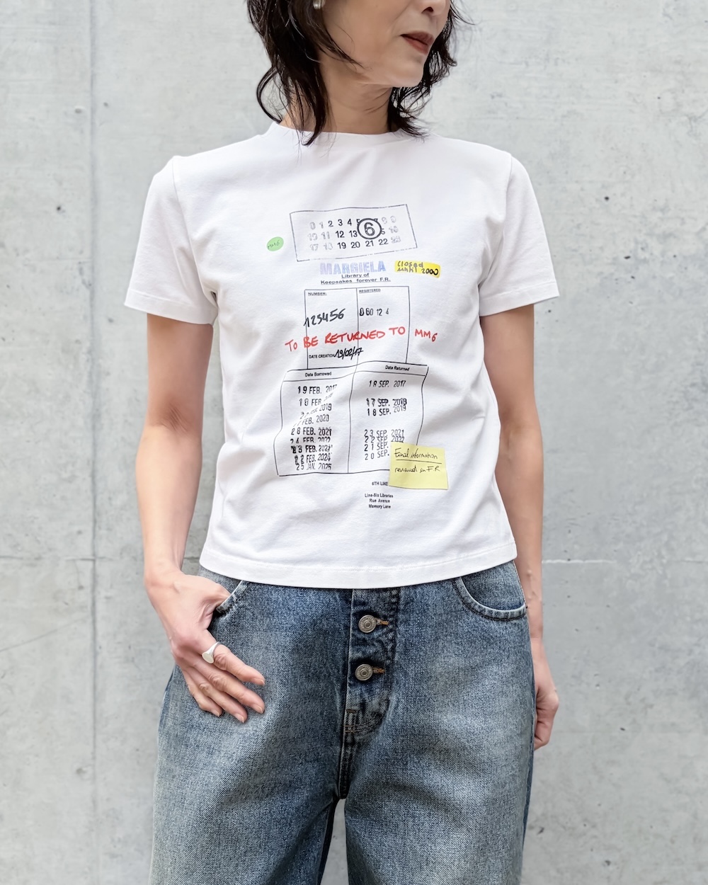 MM6のジャカード プリントを配したコットンTシャツ。スタンプ風グラフィックと手書きの文字が、図書館の記録を思わせます。クロップド丈とクリーンなシルエットで視線はプリントへ。バックには、MM6を象徴する1本の白いステッチが施されています。
