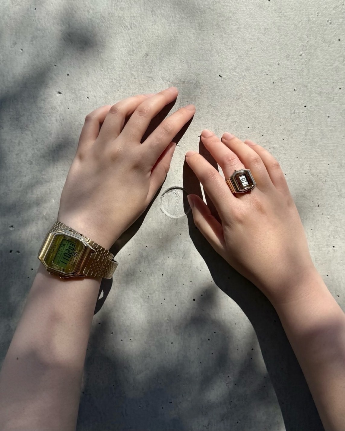 単品でもお楽しみいただけるステンレス製のブレスレットとのセットになった腕時計と、アクセサリー感覚で指に着用するリング時計の2型のラインナップとなっています。