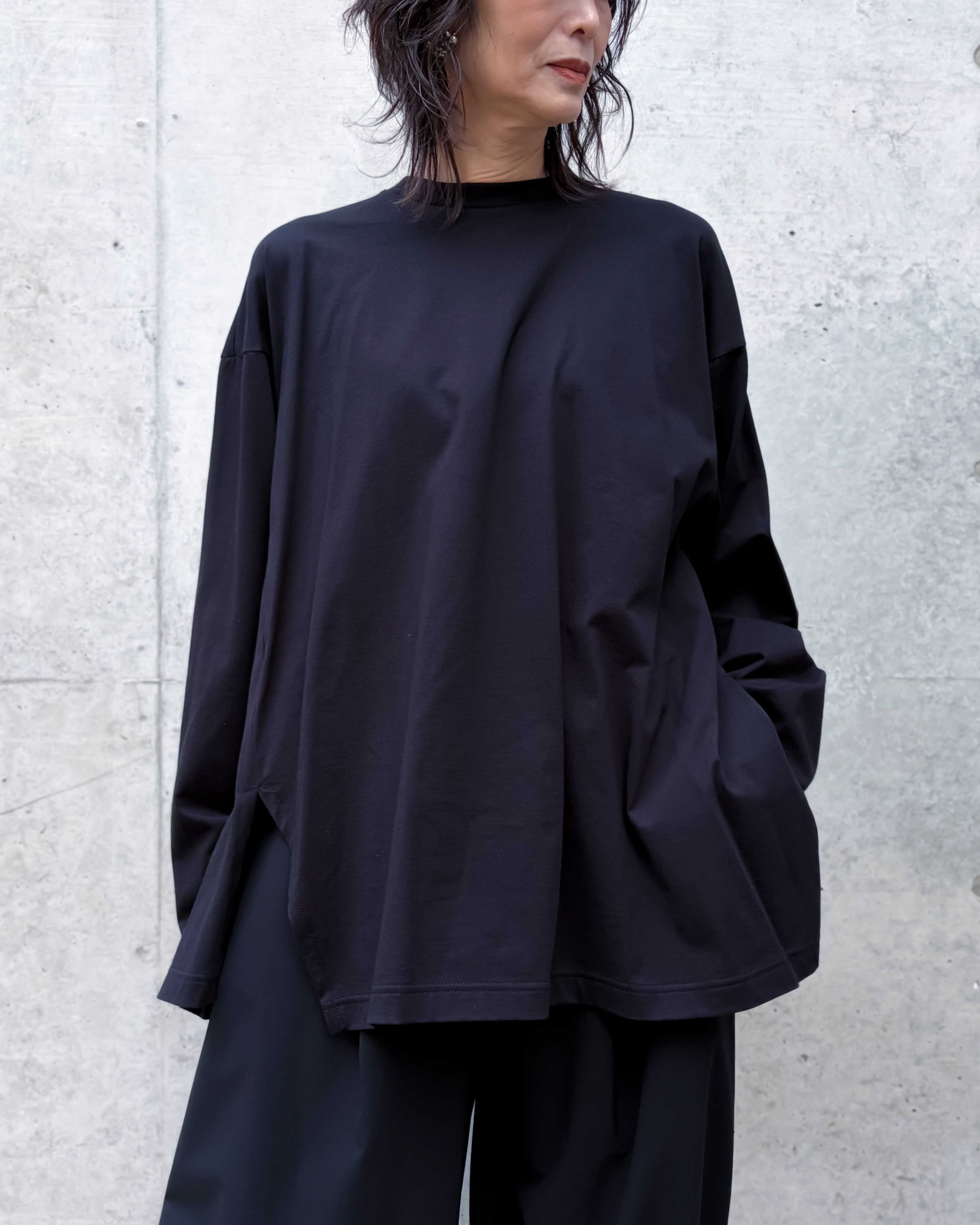斜めに入ったスリットがポイントですが、後身頃はフレアシルエットになっており、女性らしい印象がプラスされています。