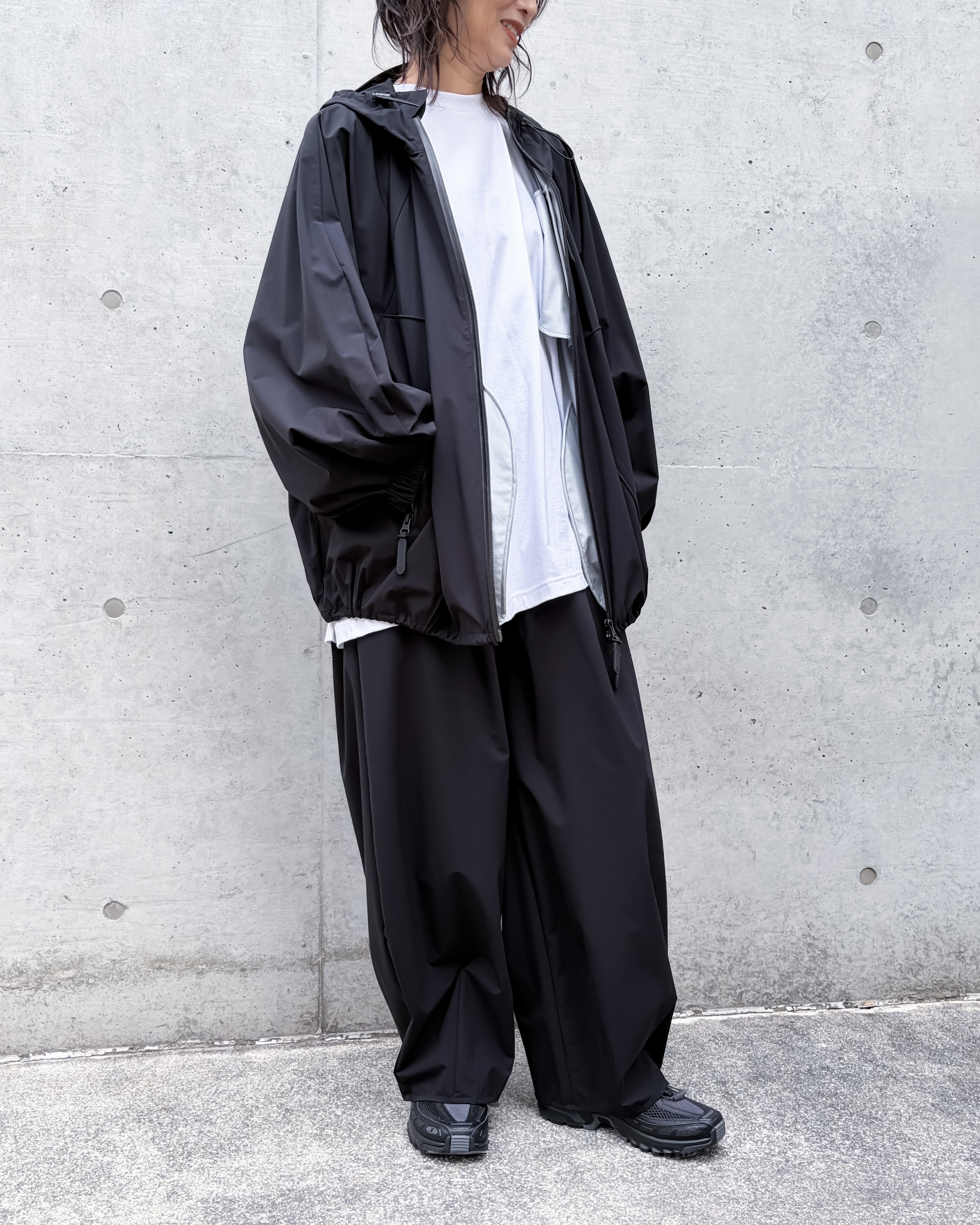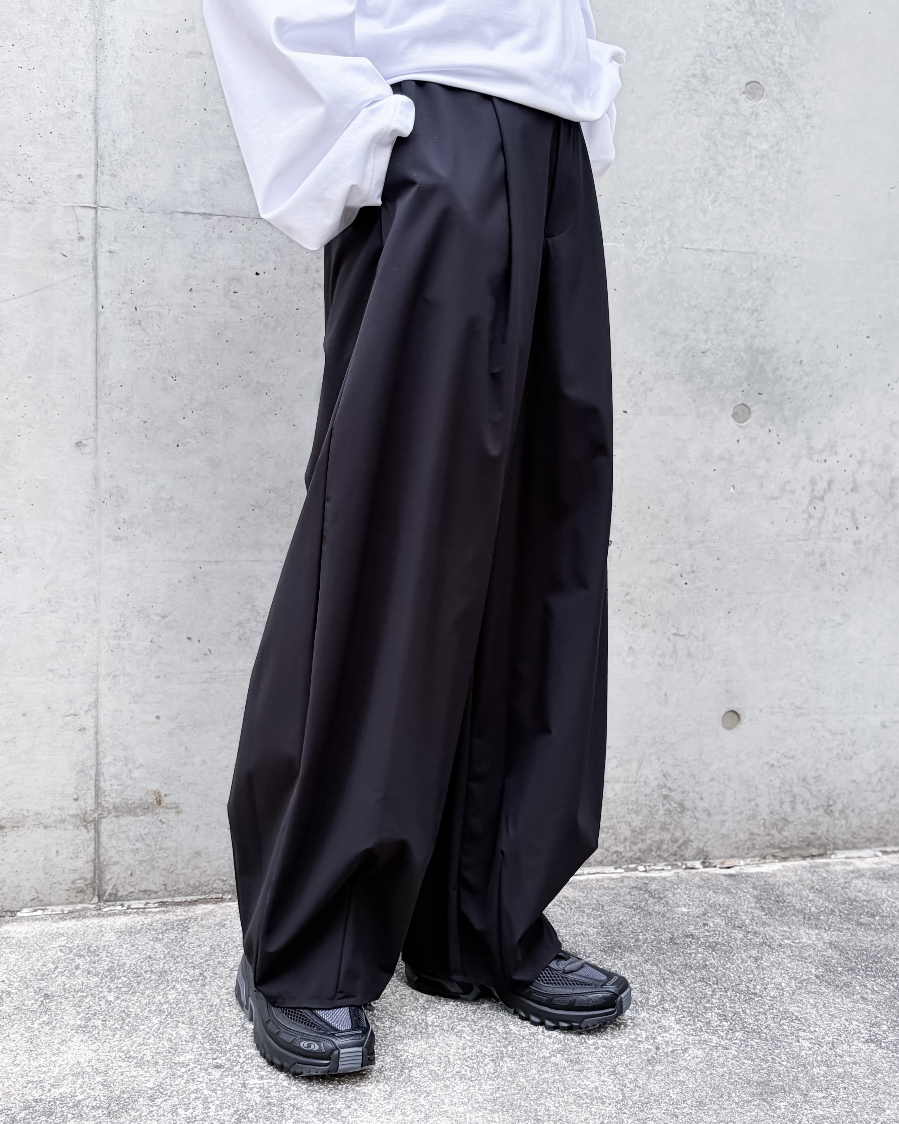 裾にタックを入れた丸みが特徴のパラシュートパンツ。