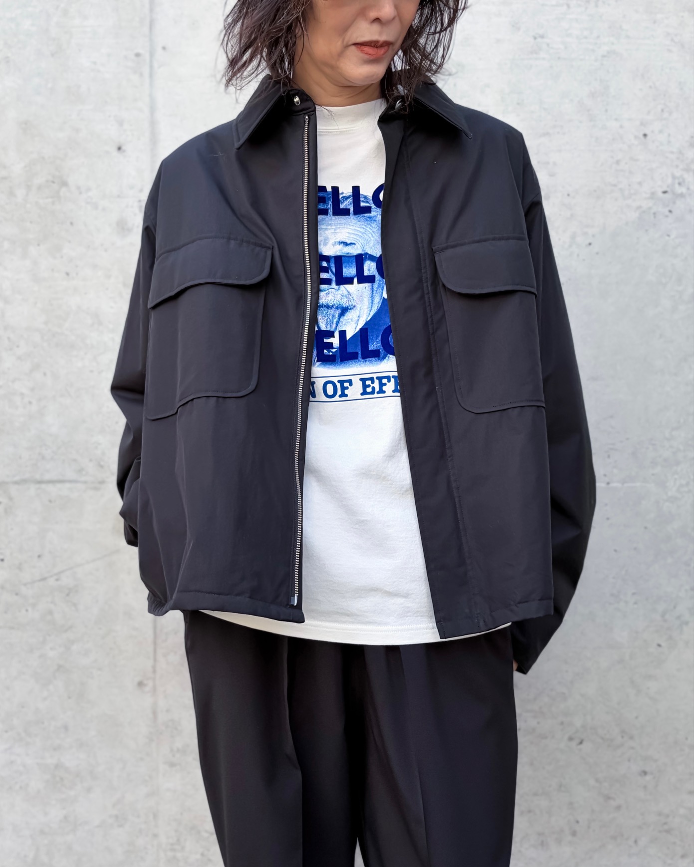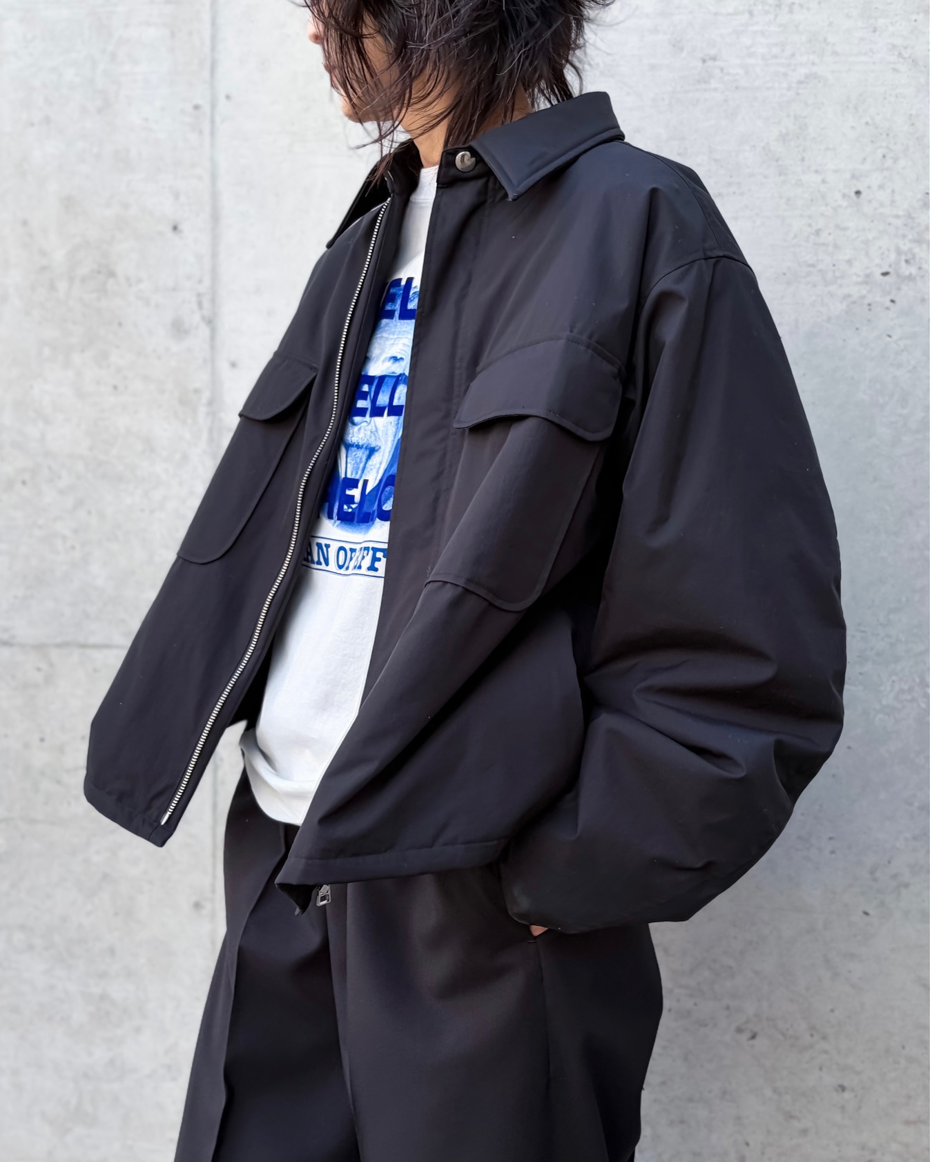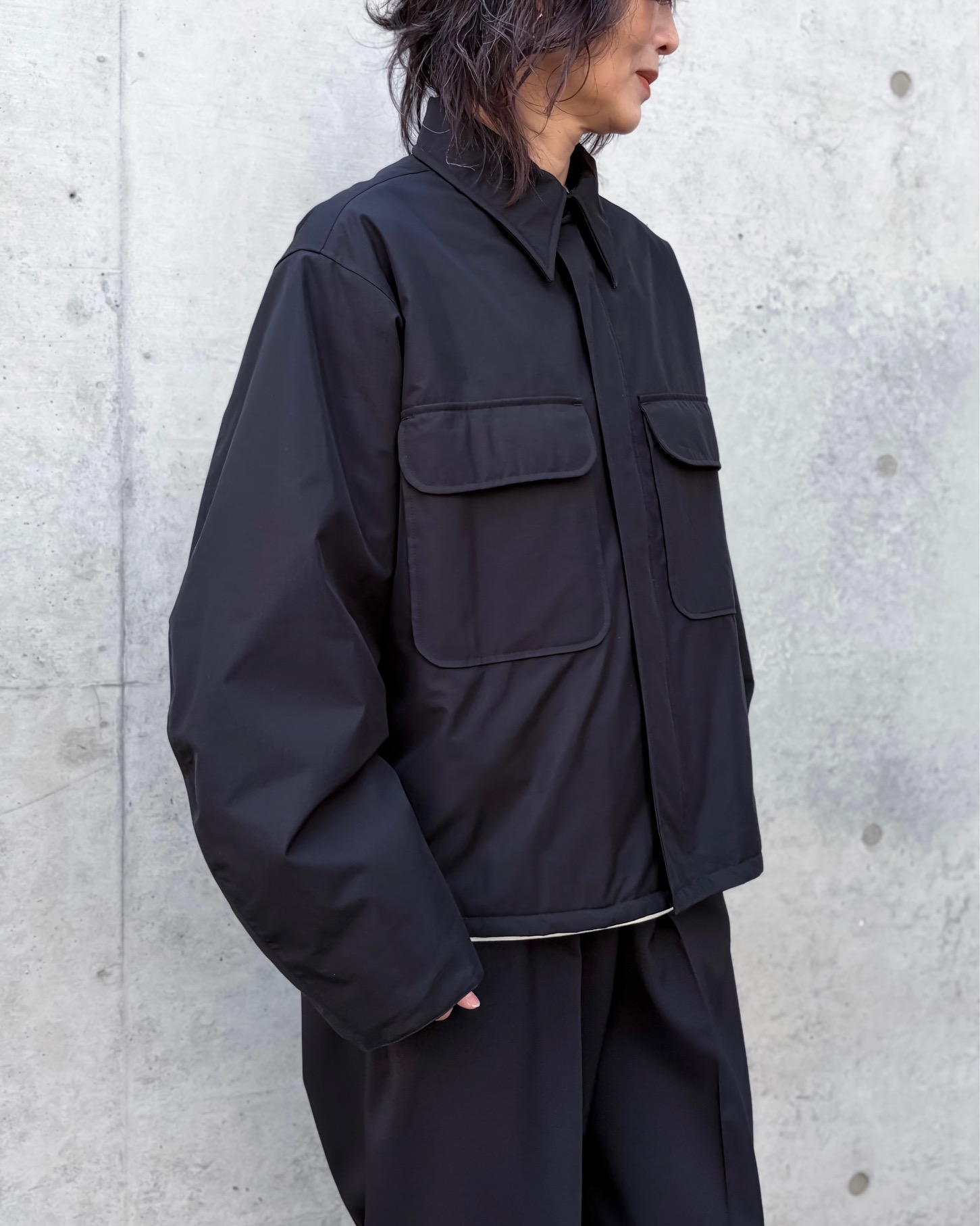 アームホールが大きめにデザインされているので、スウェットでもバルキーなニットでもするりと羽織ることができます。