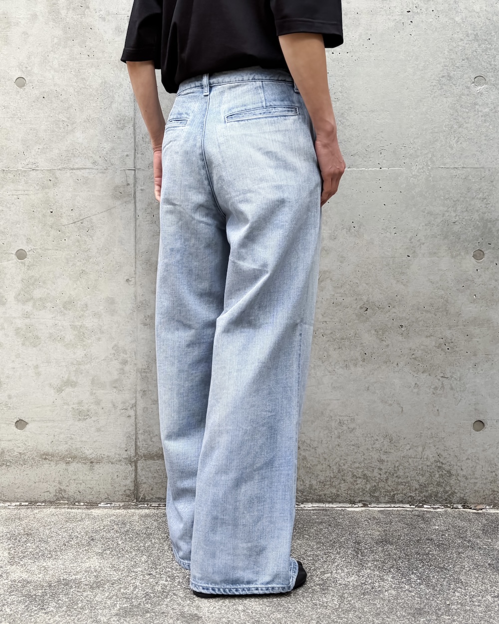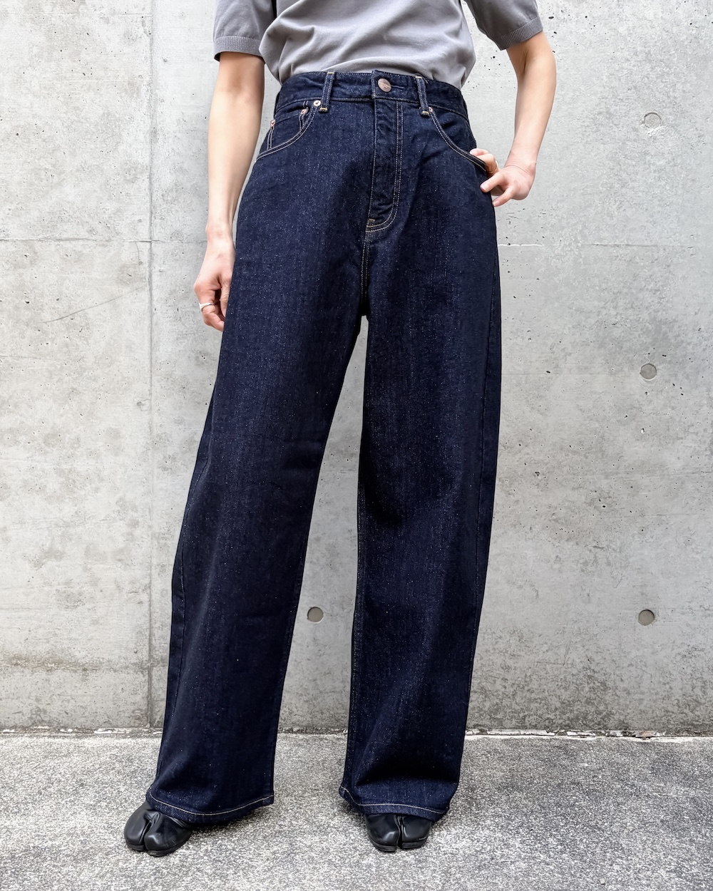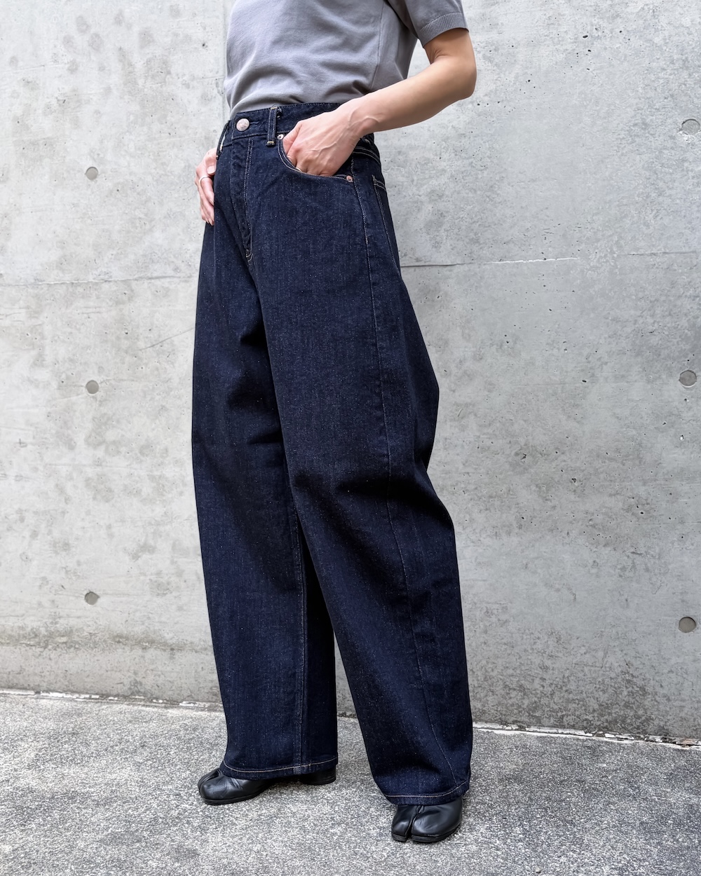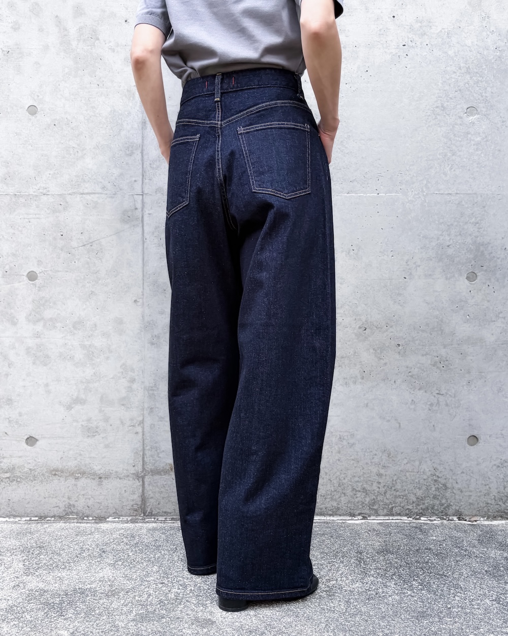 ゆるさのあるラインながら、トラウザーらしいクリーンな表情が魅力で、デニムのラフさとモード感のバランスが絶妙な1本です。