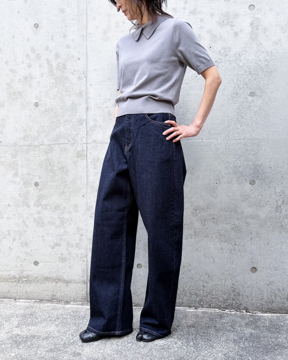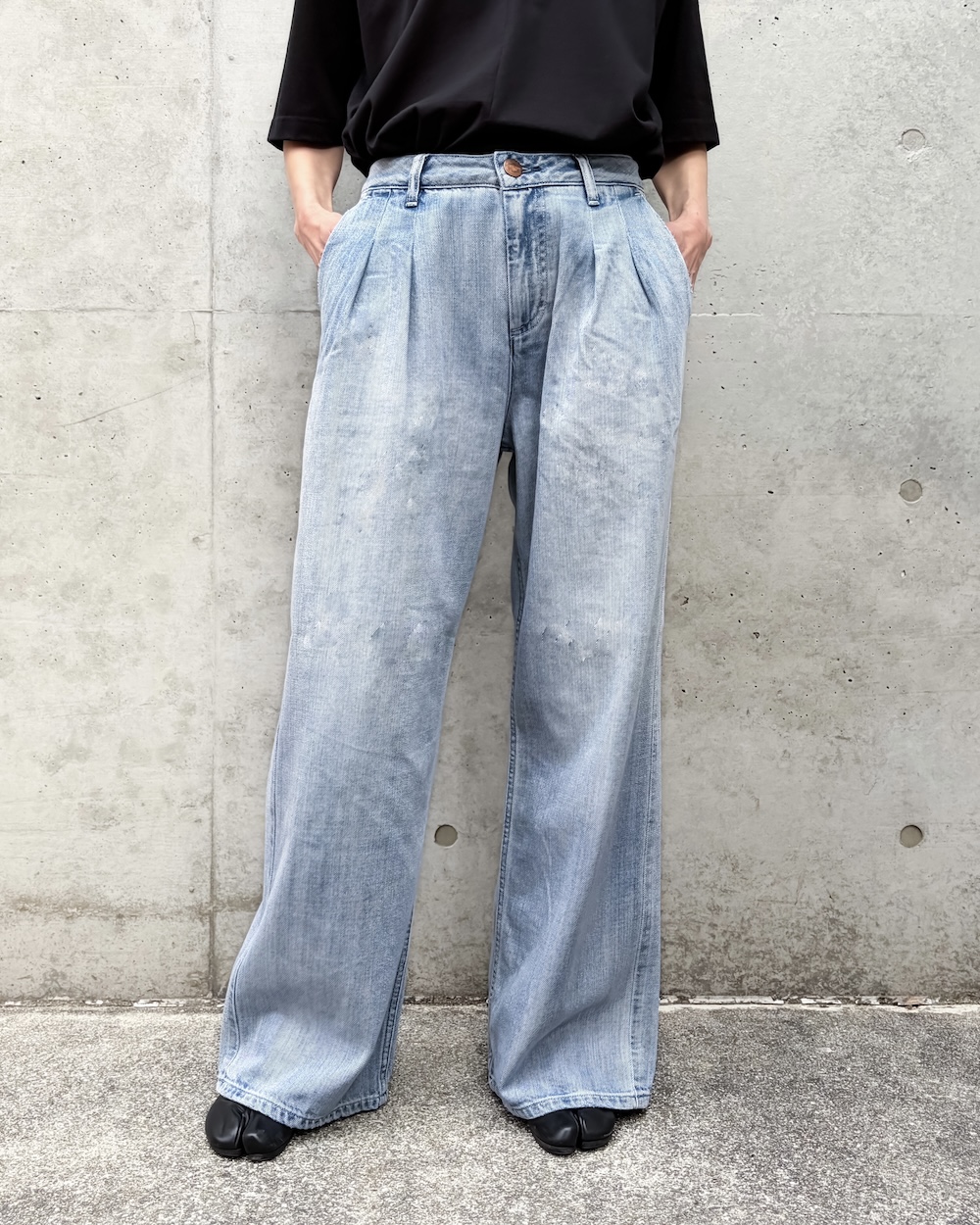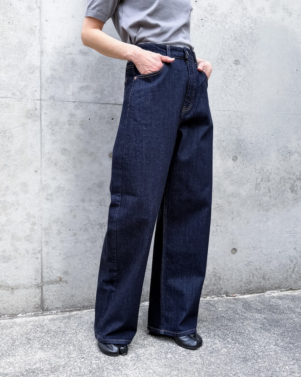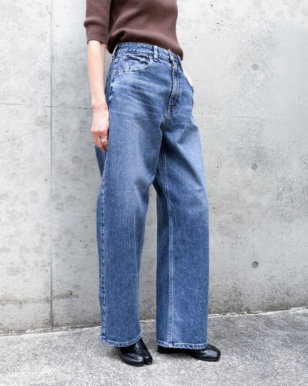 ゆるさのあるラインながら、トラウザーらしいクリーンな表情が魅力で、デニムのラフさとモード感のバランスが絶妙な1本です。