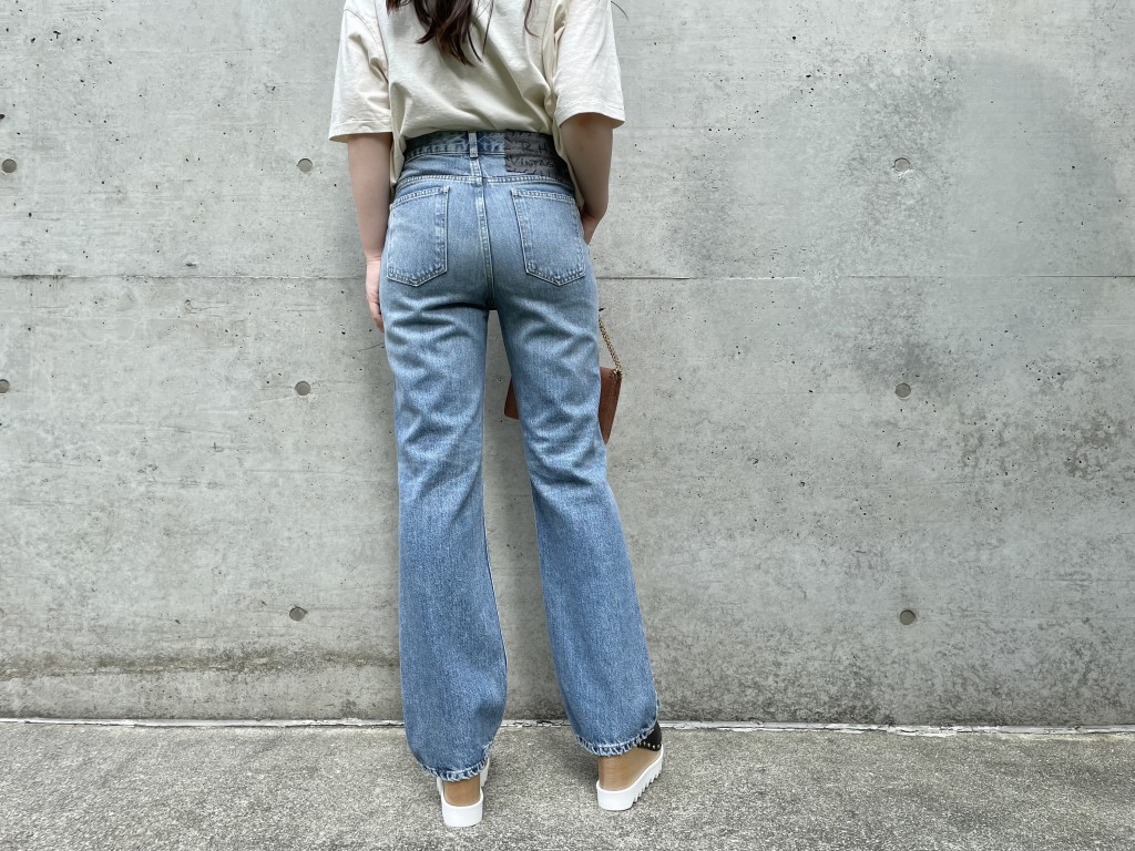 ヴィンテージ加工が施されておりますが発色の良いブルーですので、白や黒のシンプルなトップスと合わせても