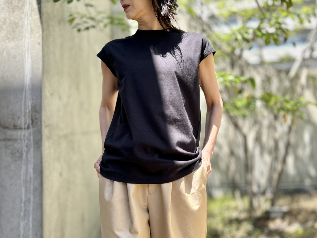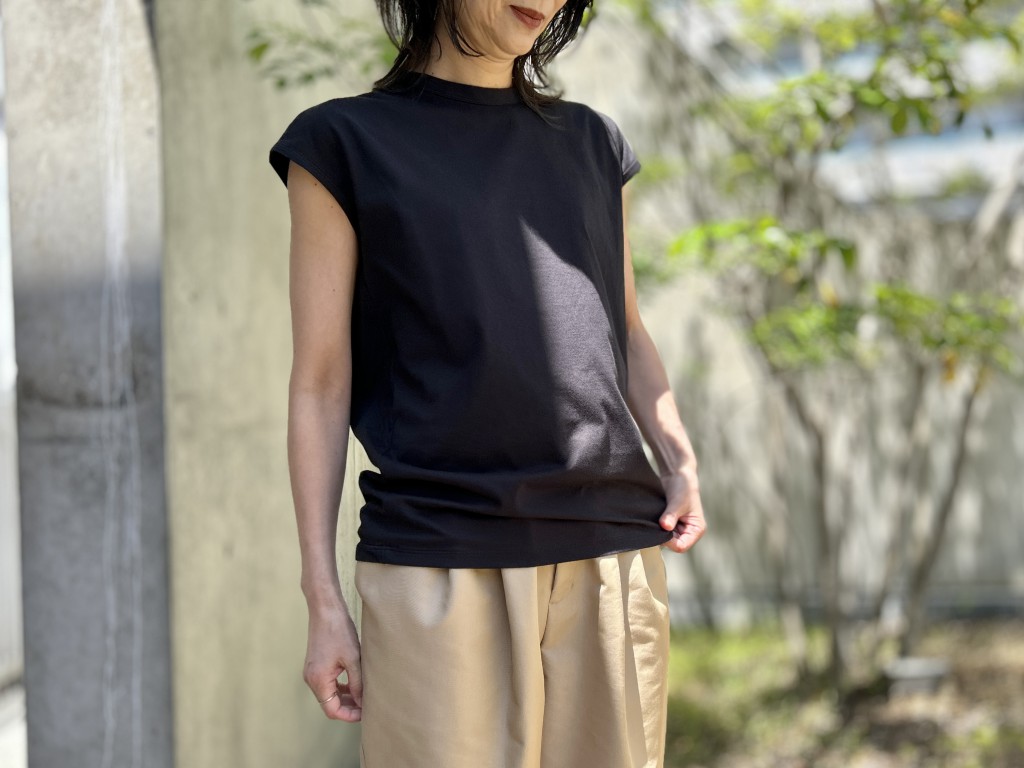 毎年夏にご好評のフレンチスリーブTEE。表面のしなやかさが特徴のオーガニック天竺は、洗っても斜行しづらい素材です。若干オフショルダー気味の肩幅と、腰で止まるテーパードしたフォルムが特徴です。