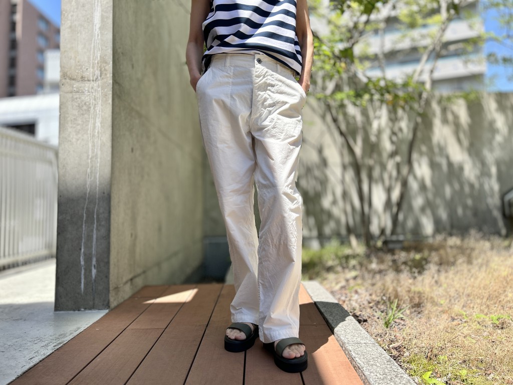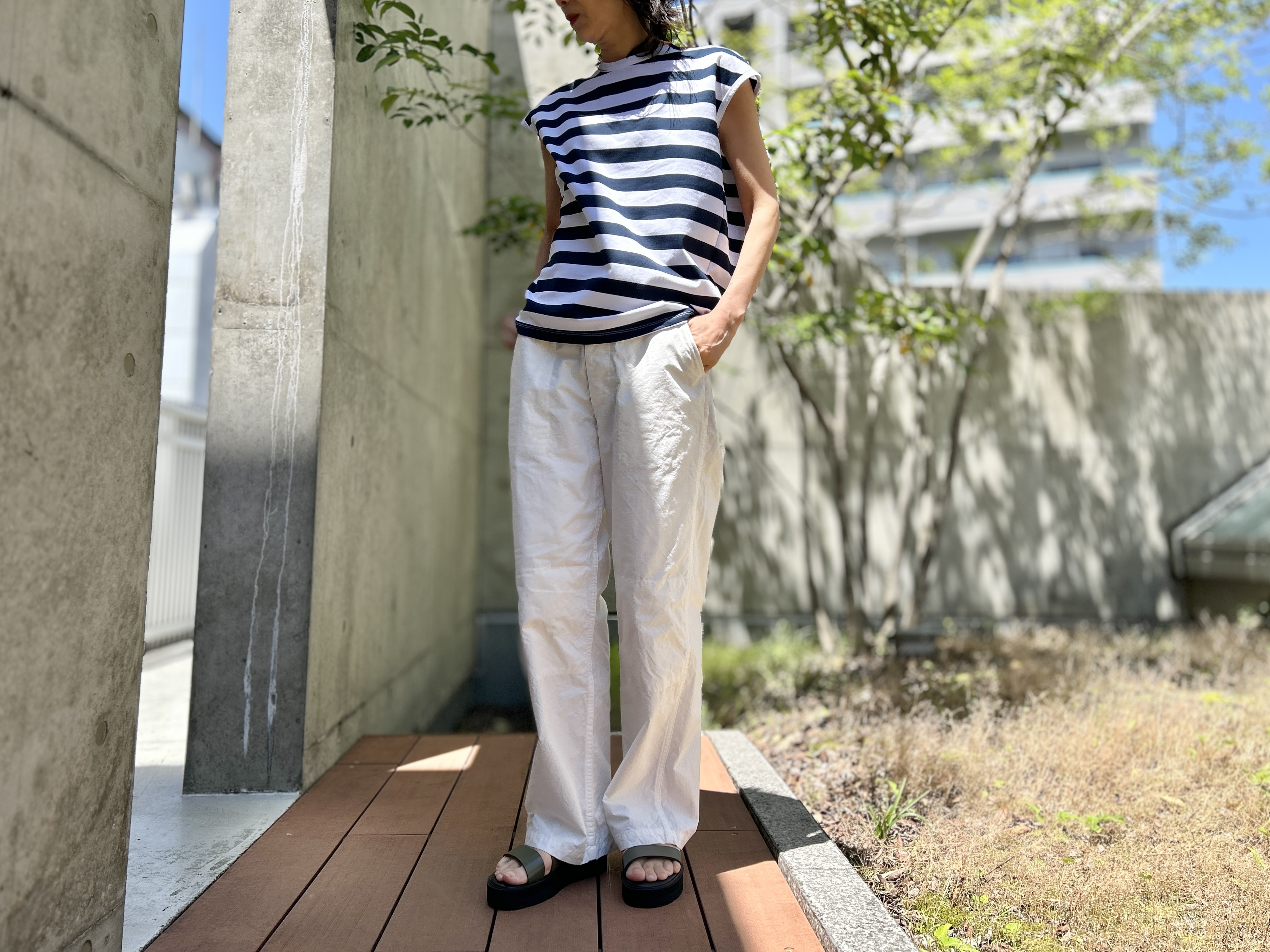 ドライ感のある軽めの生地を使用したベーカーパンツ。肌馴染みもよく、女性にも穿きやすい生地感です。